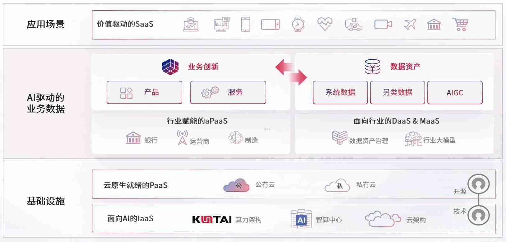 数字时代,,围绕企业数字化转型的关键要素,,ok钱包数码开创性的提出数云融合战略和技术体系框架,,着力在云原生、、、数字原生、、、AI原生和信创产业上架构产品和服务能力,,,为处在不同数字化转型阶段的快消零售、、、汽车、、、、金融、、、医疗、、政企、、、教育、、运营商等行业客户提供泛在的敏捷IT能力和融合的数据驱动能力,,,,构建跨界融合创新的数字业务场景和新业务模式,,,,助力企业级客户建立面向未来的核心能力和竞争优势,,,,全面推动社会的数字化、、智能化转型升级。。